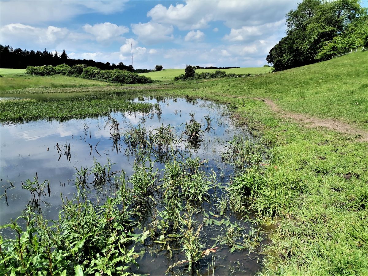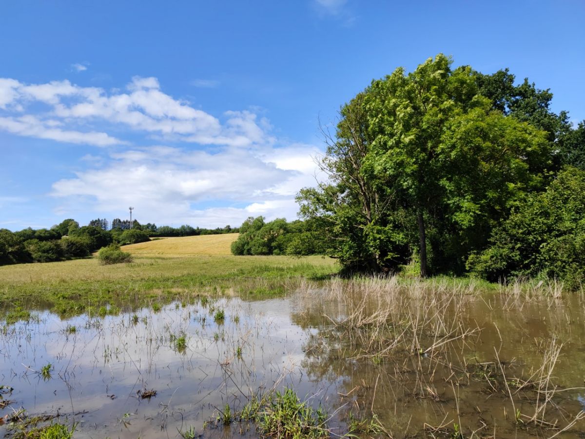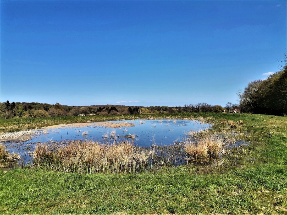 Wir tun etwas für die heimische Artenvielfalt! Im Naturerlebnisraum wurde eine eiszeitliche Senke renaturiert. Auf der Fläche „Alte Hufe“ wurden im Rahmen eines Ökokontos Kleingewässer, Gehölzinseln und extensiv bewirtschaftetes Grünland eingerichtet. 2022 entstand ein Gewässer in einer Senke auf der „Schulkoppel“ Mönchneversdorf, das sofort von der bedrohten Rotbauchunke und vielen anderen Amphibien, Libellen und Brutvögeln angenommen wurde. 2023/2024 wurden 12 Hektar Mehrschnittgrünland in den „Bolandswiesen“ zu einer naturnahen halboffenen Weidelandschaft umgewandelt. Hierfür wurden insgesamt fast 400 Meter Drainagen entnommen, um nassen Senken, Feuchtgrünland und Quellen wiederherzustellen, Müll entsorgt, und ein Zaun gebaut. Das Projekt „Bolandswiesen“ wurde vom Kreis Ostholstein gefördert. Inzwischen ist zu beobachten, dass sich viele Pflanzenarten des Feuchtgrünlandes und der Quellen wieder angesiedelt bzw. ausgebreitet haben. Die Feuchtbereiche werden von Kranich, Graureiher und Rotmilan zur Nahrungssuche genutzt; im Knick brütet der Neuntöter. Das Grünland wird extensiv beweidet mit Rindern von örtlichen Landwirten.