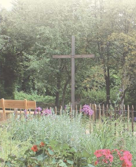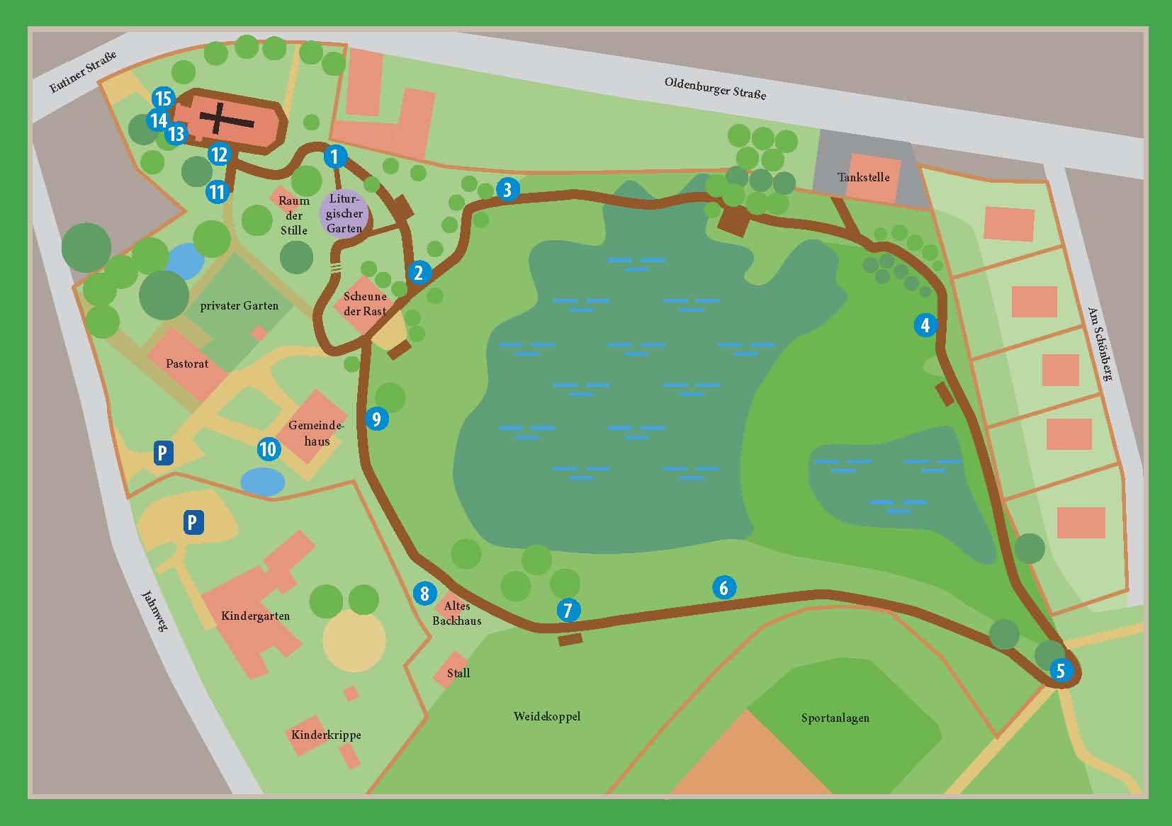Der Rundweg im Naturerlebnisraum wurde zu Pfingsten 2013 in der Tradition eines geistlichen Kreuzweges gestaltet. Unser Kreuzweg weicht allerdings von der mittelalterlichen Zählung der Stationen des Leidensweges Jesu etwas ab. Er orientiert sich an einem Text des Theologen Jörg Zink. In seinem Buch "Die Goldene Schnur. Anleitung zu einem inneren Weg" (2011) hat Jörg Zink ein Kapitel der Passionsgeschichte Jesu gewidmet und sie in Form einer eigenen Kreuzwegmeditation erzählt. Die Darstellungen dieses Kreuzweges wurden von dem in Nordfriesland lebenden Bildhauer Ulrich Lindow geschaffen, der sich auch mit Gartengestaltung befasst und mit verschiedensten Materialien wie Holz, Stein und Metall arbeitet.